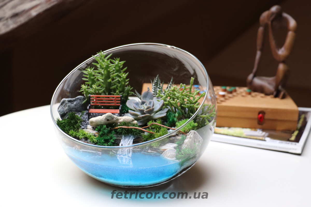 Не так давно, у 2024році ми почали створювати флораріуми з імітацією водойми. Це застигла епоксидна смола, яка трошки підфарбована у блакитний чи синій колір. Виглядає дуже естетично, природньо та натурально. Нам то дуже подобається) Створити таку водойму, ми можемо у будь-якому флораріумі, що вам подобається. Але треба замовити завчасно за 7-10 днів, щоб воно добре застигло.