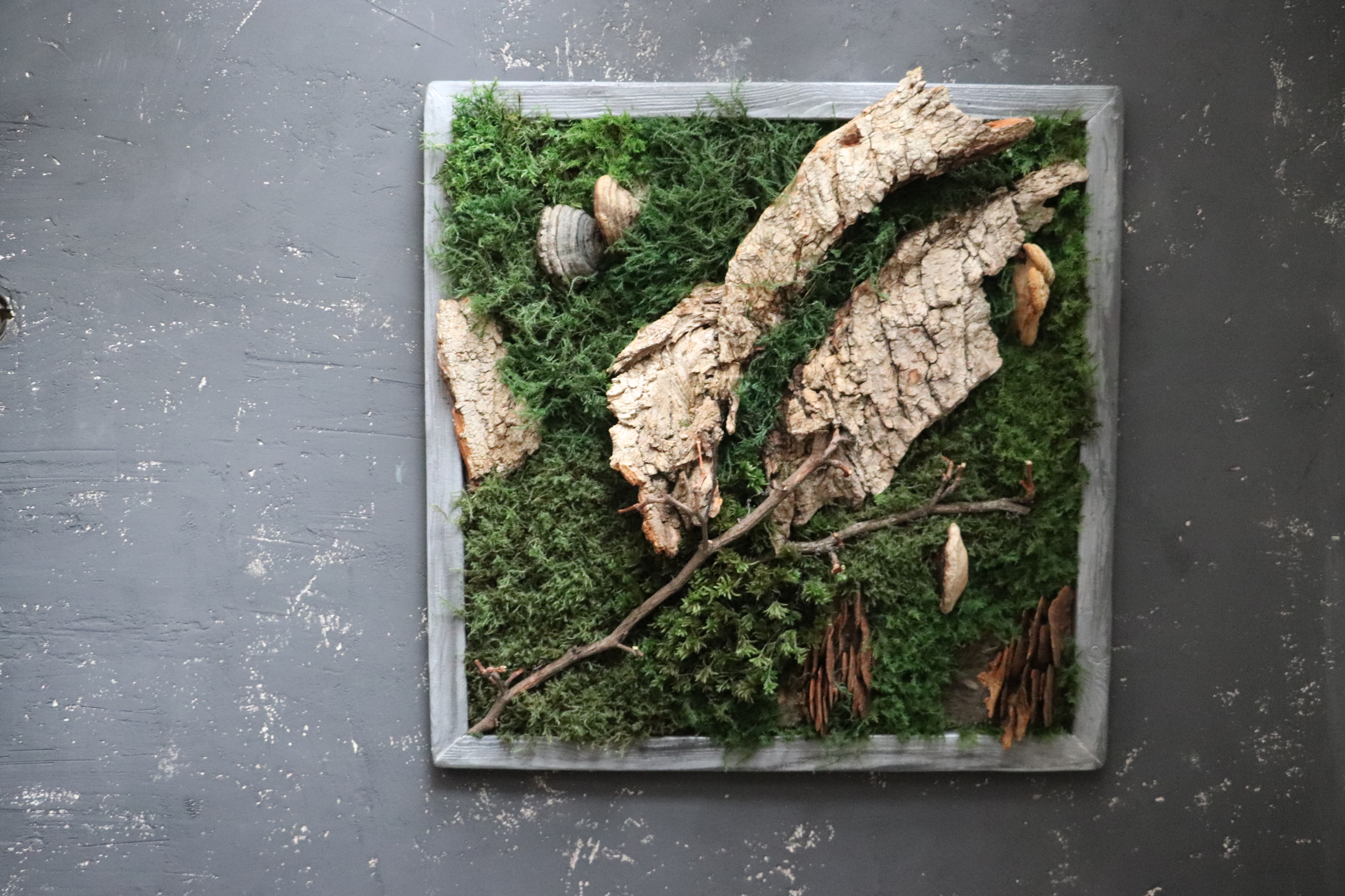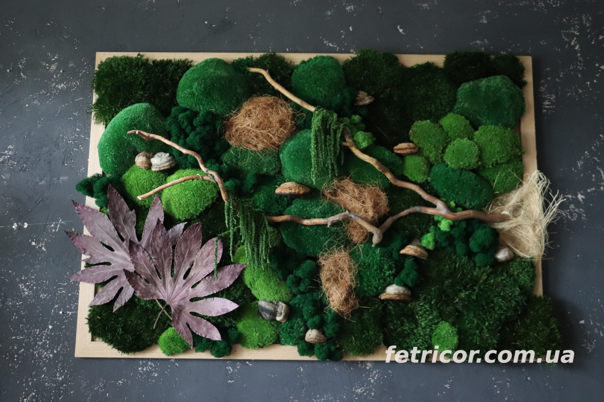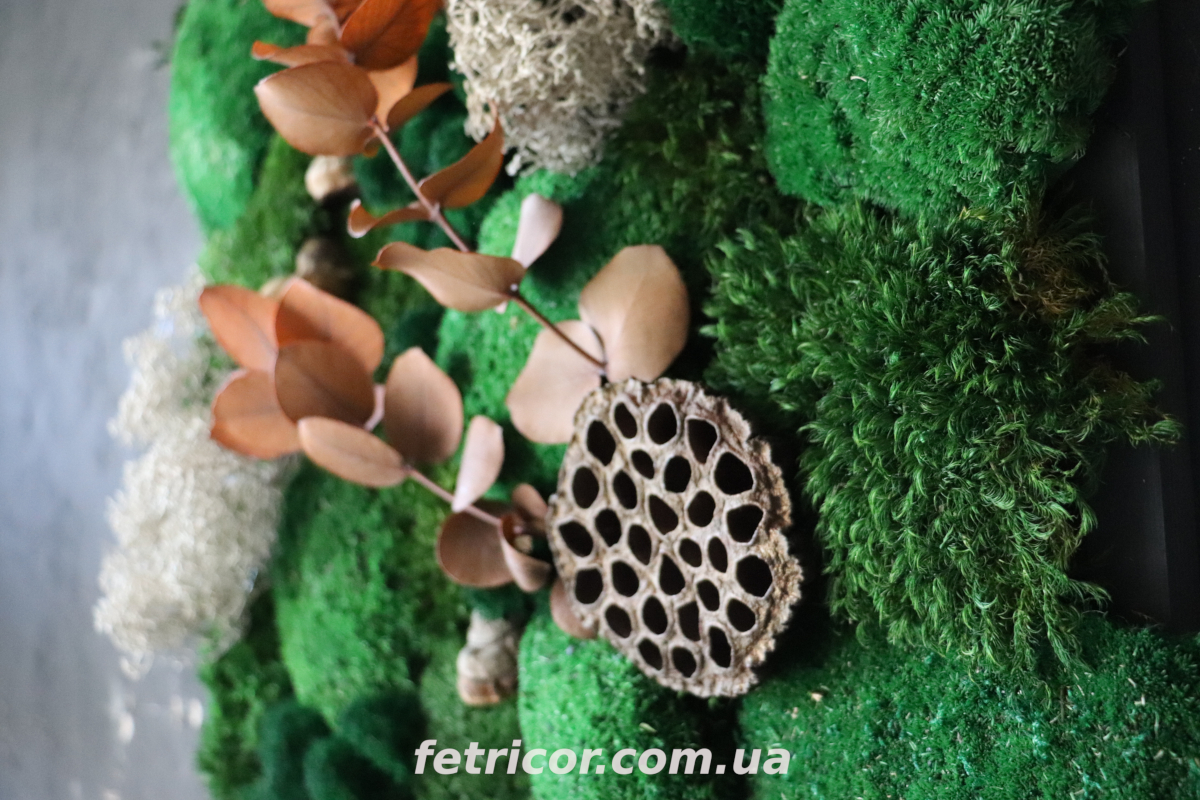 Особливою категорією є наші фіто-картини з стабілізованим мохом та природним декором. До речі, це улюблена робота нашої засновниці – створювати рослинні картини. У таких картинах, ми використовуємо мох, який самі збираємо та стабілізуємо. Насправді, процес стабілізації досить простий та екологічний. Мох просто вимочується у розчині води та гліцерину. Але треба знати нюанси) Еко-картини створюємо різних форм, стилів та жанрів. Я не знаю чому, але для нас, це якесь самобутнє мистецтво.