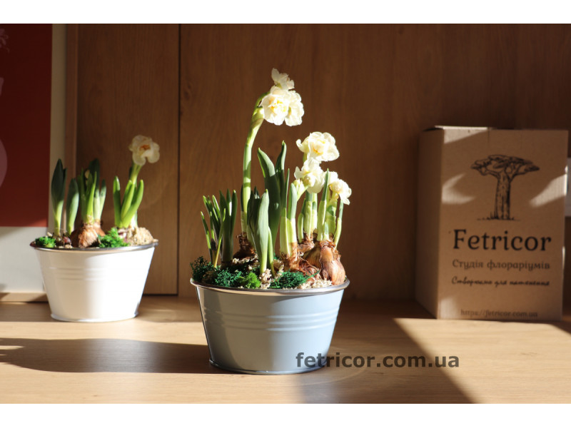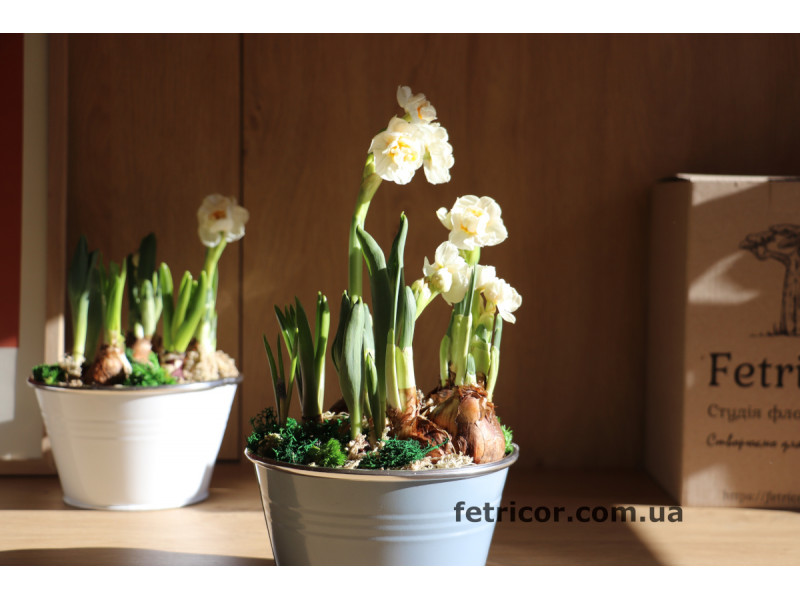 Особливість весняних композицій в тому що, кашпо можна використовувати для декорування інтер'єру після цвітіння квітів, а цибулинки, як оцвітуть можна посадити в відкритий грунт або потримати в темному місці до наступного сезону та знову висадити.