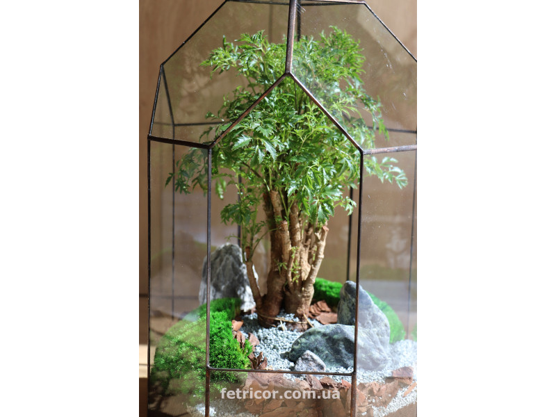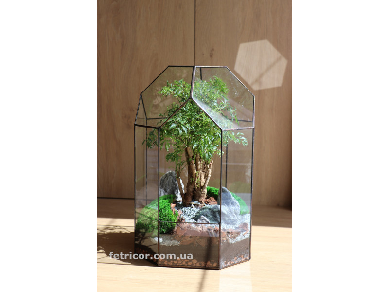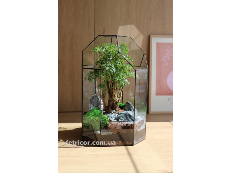 Прозорі стінки забезпечують рівномірне освітлення і підкреслюють красу кожного елементу, а також допомагають підтримувати сприятливий мікроклімат. Флораріум не потребує складного догляду — достатньо помірного поливу та розсіяного світла.