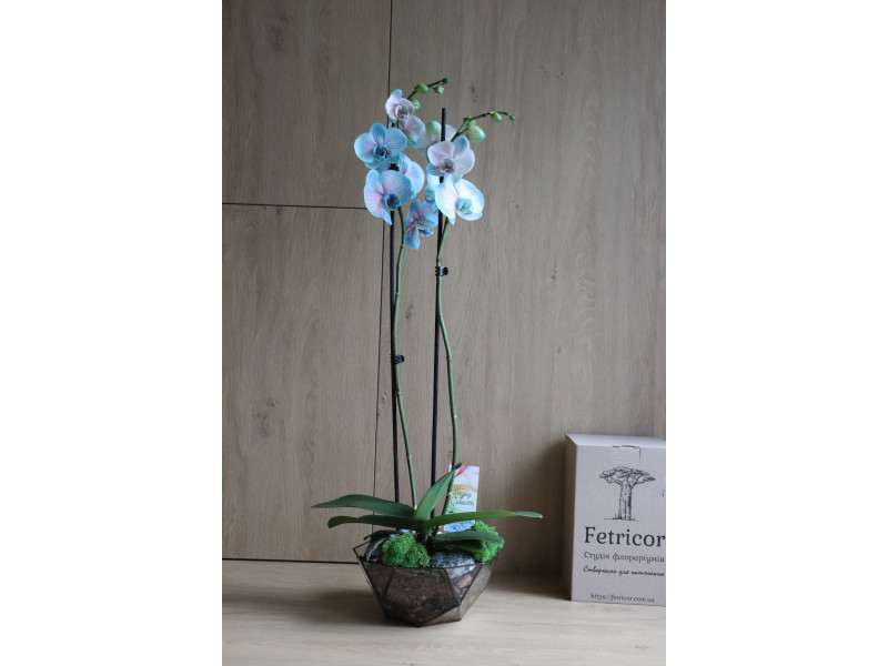 Догляд: Розмістіть композицію ближче до сонячного світла (уникаючи прямих сонячних променів, це важливо) та поливайте раз на 6-8 днів невеликою кількіст'ю води (100-120мл.), під основу орхідеї. Листя слід протирати час від часу вологою ганчіркою від пилу. Замітка: компанія Фетрікор залишає за собою право вносити деякі дизайнерськи зміни, які не вплинуть на стиль та цінність композиції.