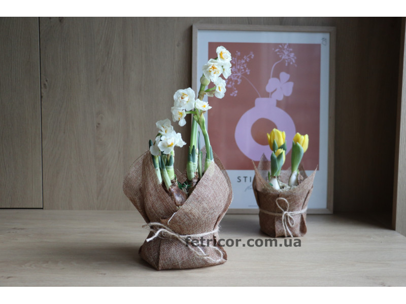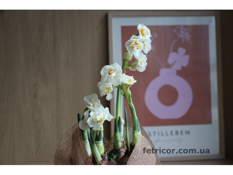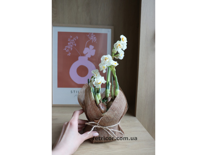 Піоновидні ароматні білі нарциси в горщику, який обрамлений декоративною мішковиною. Стильний та естетичний подарунок до свята Весни.