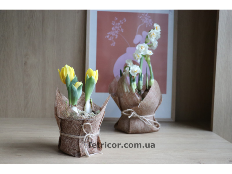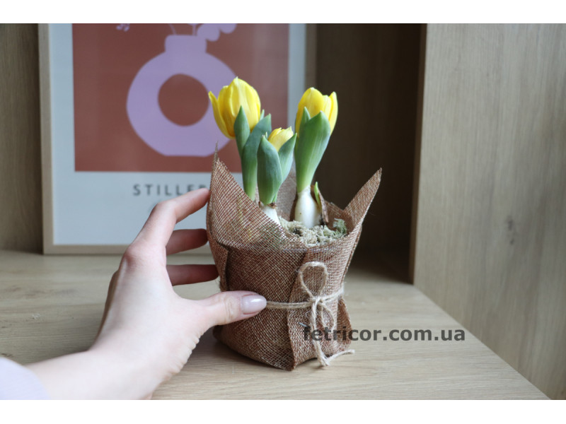 Мініатюрні жовті тюльпани в горщику, який обрамлений декоративною мішковиною. Стильний та естетичний подарунок до свята Весни.
