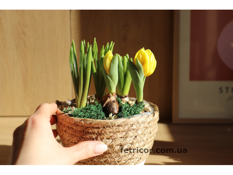 Особливість весняних композицій в тому що, кашпо можна використовувати для декорування інтер'єру після цвітіння квітів, а цибулинки, як оцвітуть можна посадити в відкритий грунт або потримати в темному місці до наступного сезону та знову висадити.