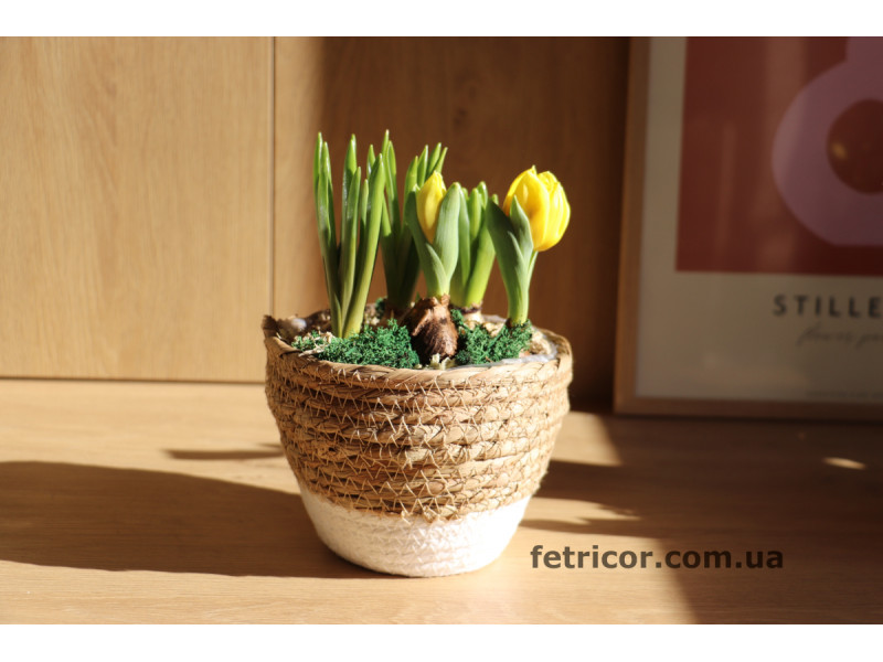 Пропонуємо вам весняні кашпо з первоцвітами. Великий вибір форм та фактур: міні-скляночки з 1 тюльпаном, металеві кашпо з нарцисами та крокусами, солом'яні корзинки з мускарі, флораріуми з квітами, текстильні та жгутові інтер'єрні кашпо з різноманітними первоцвітами.