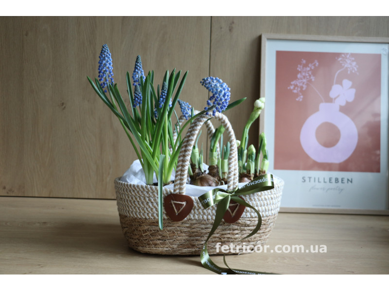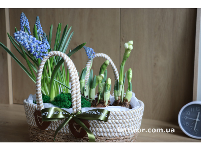 Первоцвіти в композиціях будуть різні в залежності від поставки (тюльпани, нарциси, мускарі, гіацинти, крокуси та ін). Буде сбалансова та гармонійна весняна композиція.