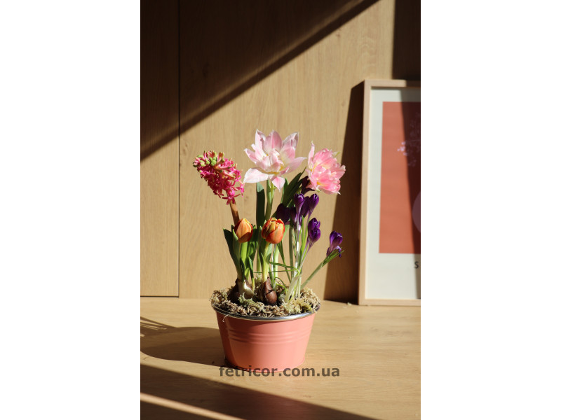 Первоцвіти в композиціях будуть різні в залежності від поставки - 7-8 цибулинок (тюльпани, нарциси, мускарі, гіацинти, крокуси та ін). Буде сбалансова та гармонійна весняна композиція.