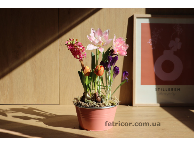 Особливість весняних композицій в тому що, кашпо можна використовувати для декорування інтер'єру після цвітіння квітів, а цибулинки, як оцвітуть можна посадити в відкритий грунт або потримати в темному місці до наступного сезону та знову висадити.